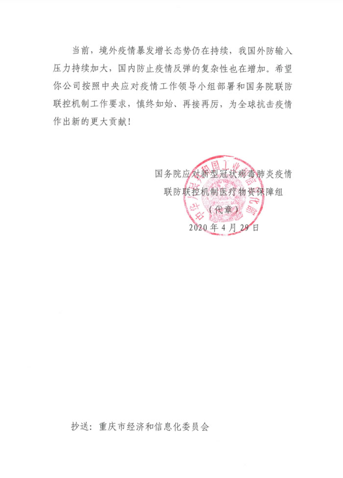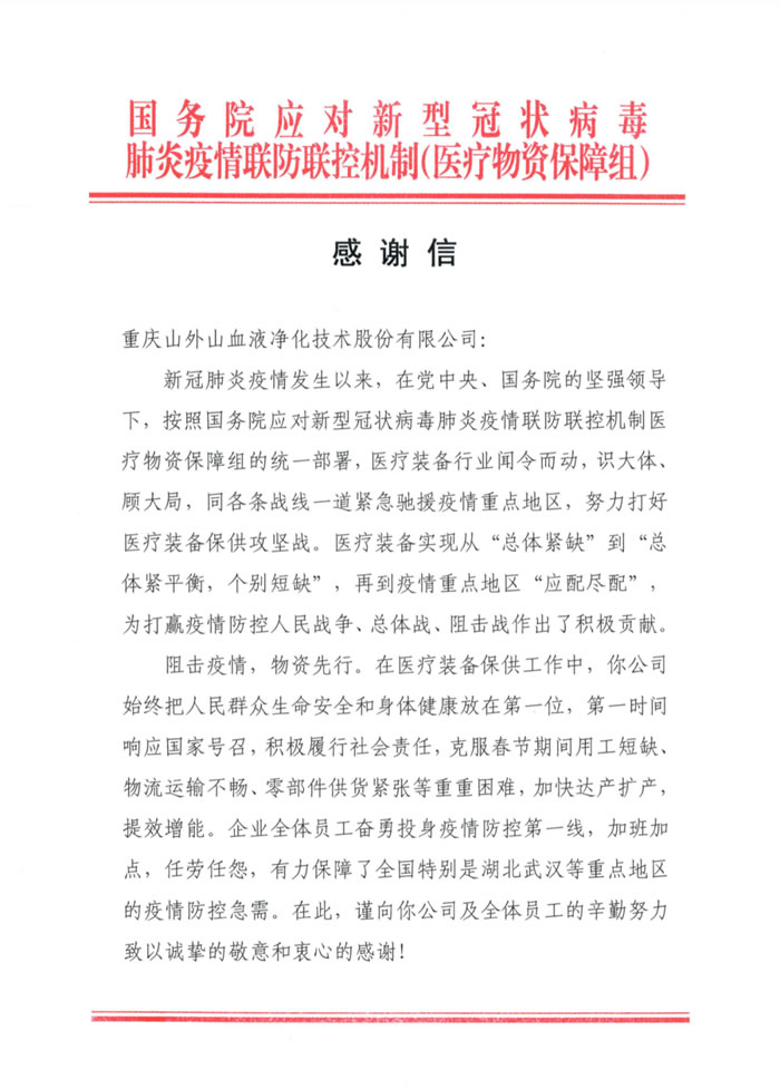 2020年4月29日,國務院應對新型冠狀病毒肺炎疫情聯(lián)防聯(lián)控機制醫(yī)療物資保障組發(fā)來一封沉甸甸的感謝信,對山外山在打好醫(yī)療物資保供戰(zhàn)中作出的突出貢獻表示肯定,并鼓勵企業(yè)再接再厲,再創(chuàng)佳績。