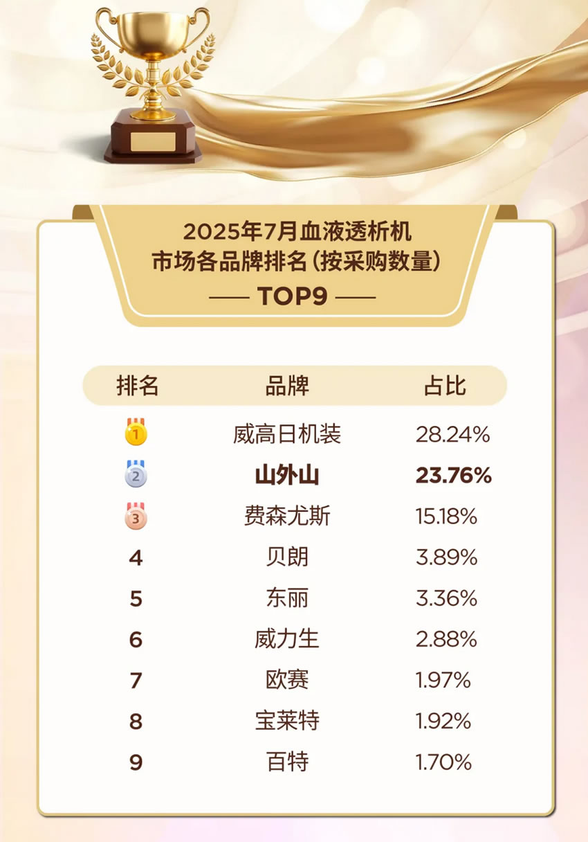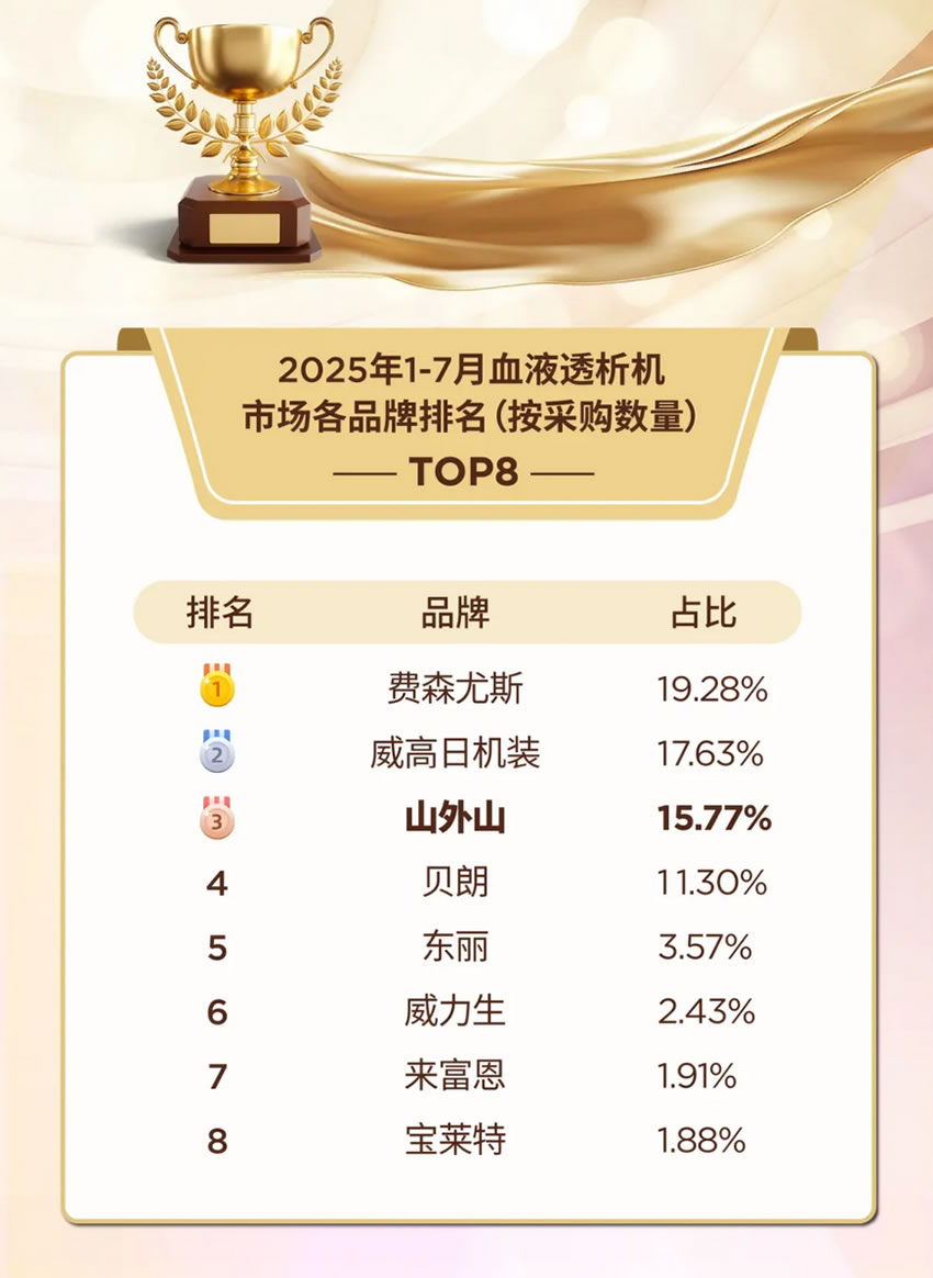 從更長周期的市場格局來看,2025年1-7月,山外山血液透析機的市場占比達15.77%,持續(xù)穩(wěn)居行業(yè)前三,同時保持著國產(chǎn)自主品牌第一的領(lǐng)先地位,中長期競爭力穩(wěn)固。